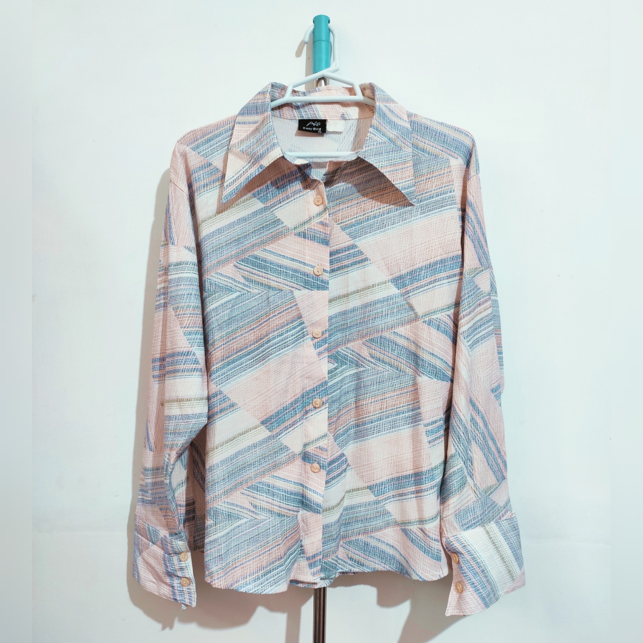 شومیز خارجی ،رنگش ملیح و همه پسنده ،بافت پارچه ش حالت پلیسه طوره ،قد حدود 65 سانت،قد آستین حدود 58 سانت وفاصله دو زیر بغل حدود 56 سانت