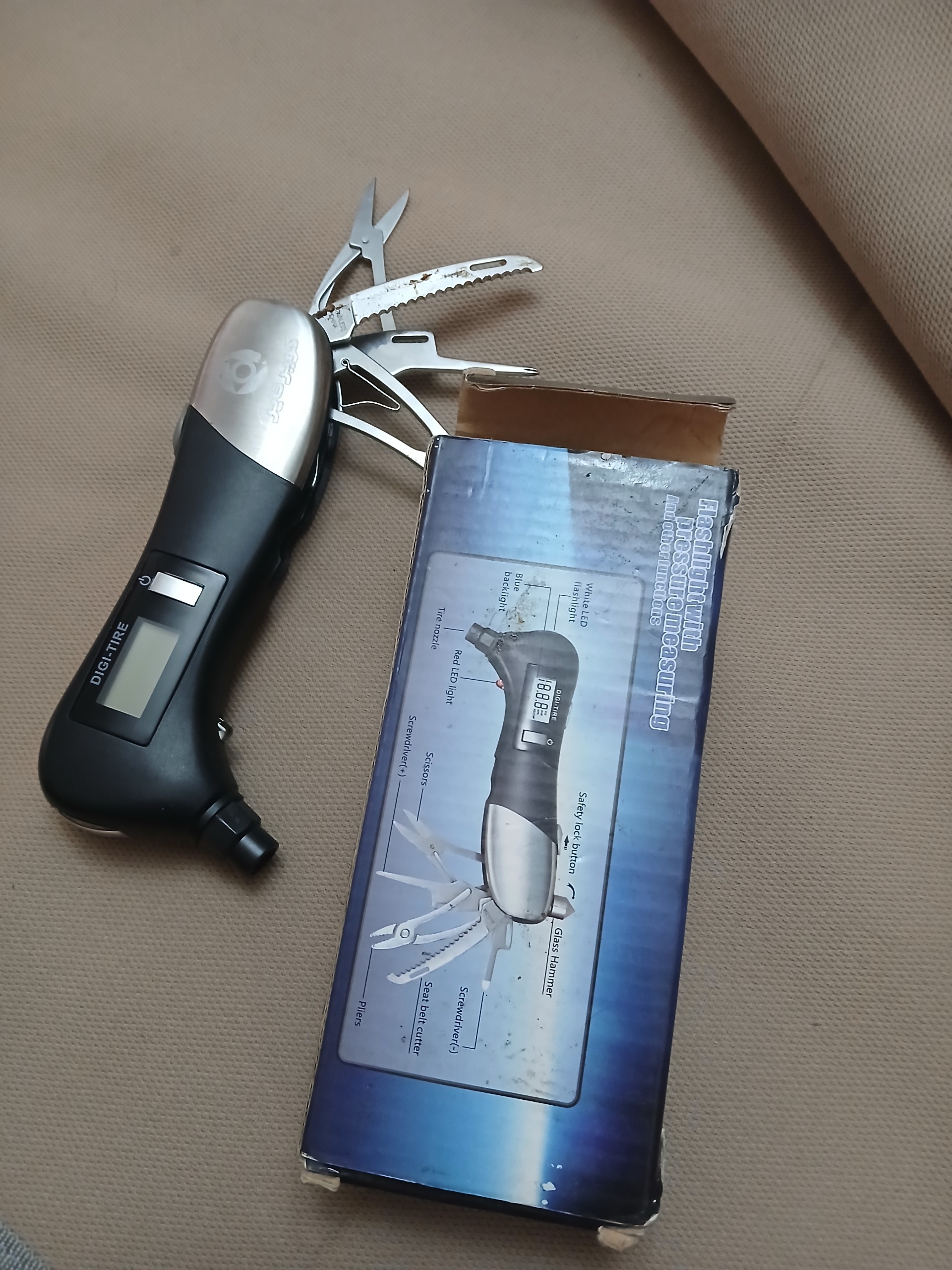گیج باد سنج دیجیتالی برای شرکت ایران تایر هست . خیلی با کیفیت و جنس خوب . استفاده نشده اصلا به همین خاطر نمیدونم قسمت دیجیتال و لامپ و بادسنج سالمن یا خیر . چون باتری داخلش ننداختم.ابزار و شیشه شکن اضطراری داره