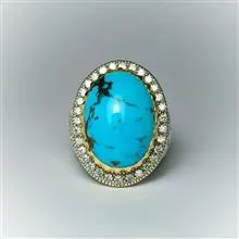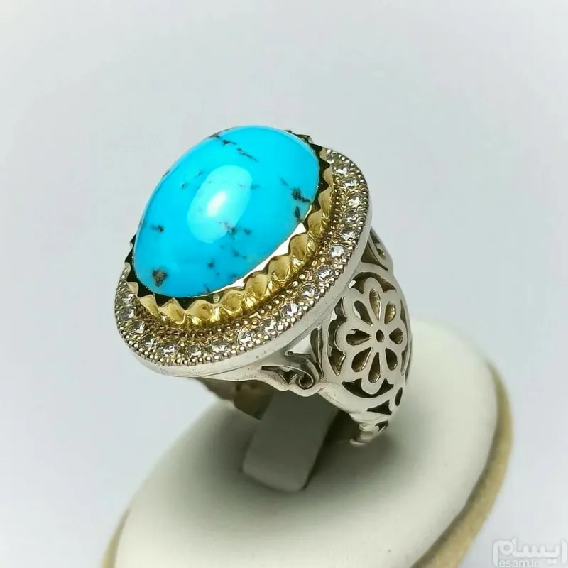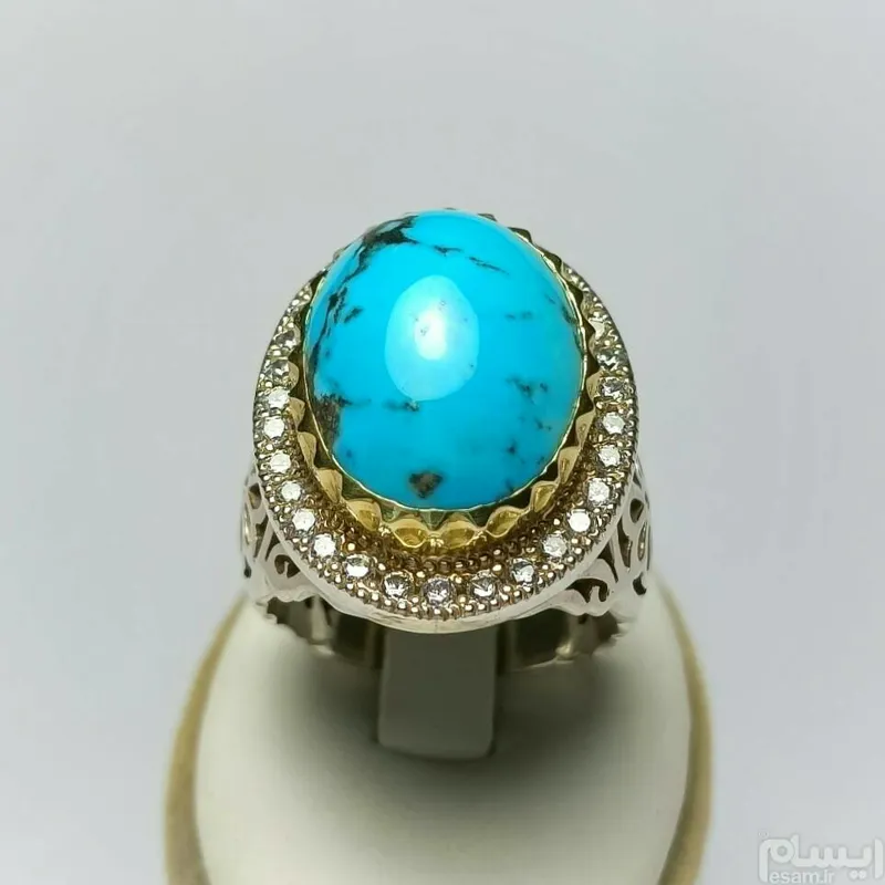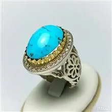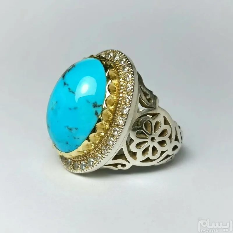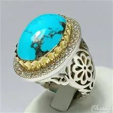 فیروزه نیشابوری نابِ بسیار خوشطبع درجهیک درشت، مغز سنگ رنگ محک، بسیار خوش طبع و رنگ، اصیل و قوارهدار. تراش بینقص بیضی دامله و ارتفاع دار، با رگههای زیبا و هارمونیک و جلا پولیش آینهای. رکاب کاملا دستساز ضخیم و جوندار، با مخراجکاری بسیار حرفهای و پُرتراکم و بینقص 33 قطعه بلر اتریشی با بهترین کیفیت موجود و "تلألوی خیره کننده که در عکسها نمایان نمیباشد" تمام شبکه ارهکاری شده کله برنجی طلاییِ رنگ ثابت دور بسته ابزار خورده با طراحی پرکار و خاص و بدون مشابه (اگر توجه بفرمایید، باخلاقیتِ هوشمندانهای از چنگی کردن دورقابِ نگین که بمراتب راحتتر از دوربسته است صرف نظر شده و سعی شده باطراحیِ خاصی دور قابِ نگین، دوربسته و کنگرهای شود که جلوهی زیباتر و نفیستری داشته باشد) شبکه زنی پرکار و دقیق سفارشی ساز. کار دست بامهر استاد سازنده. عیار استاندارد 925 سایز رکاب 64_65 اثری فاخر، اصیل و ارزنده