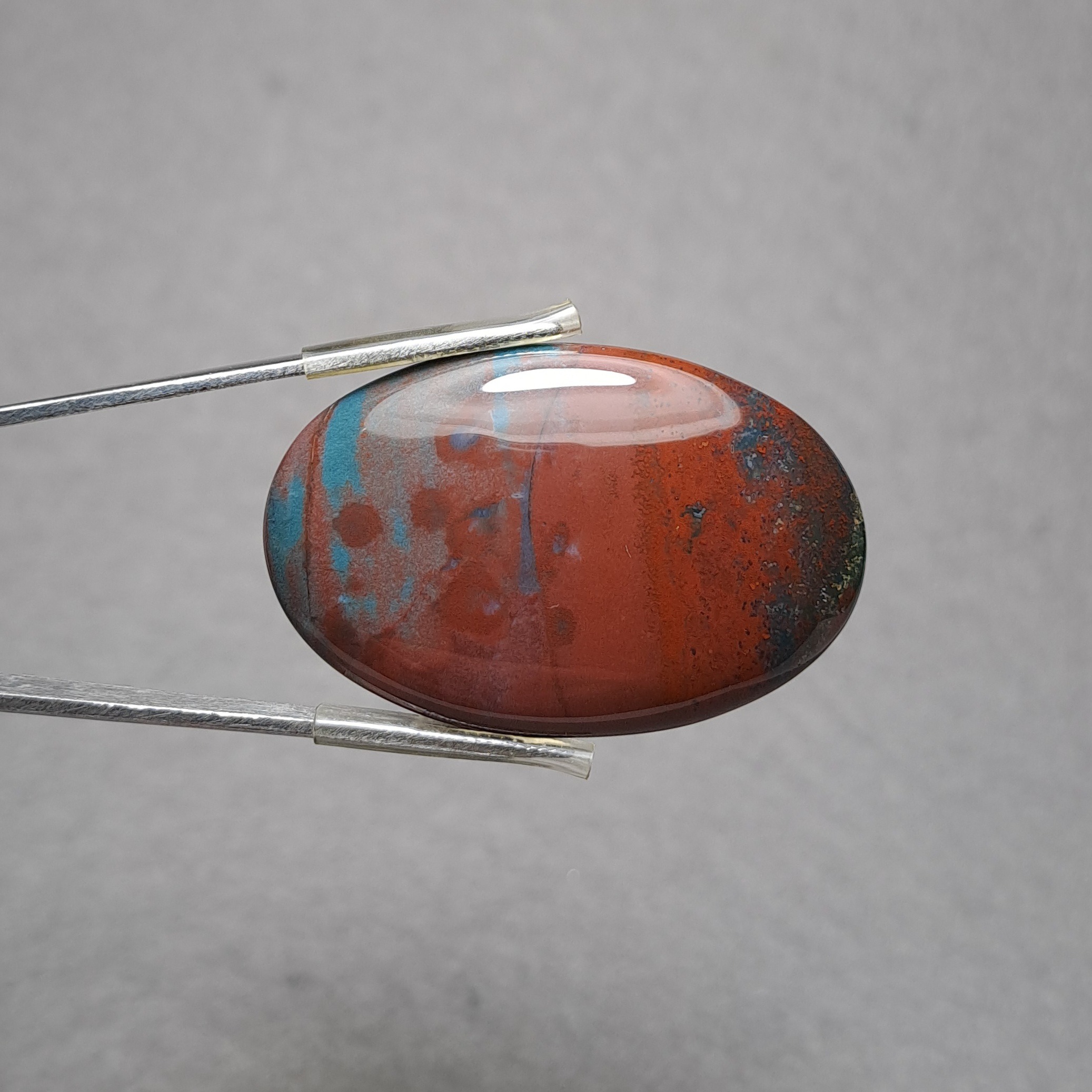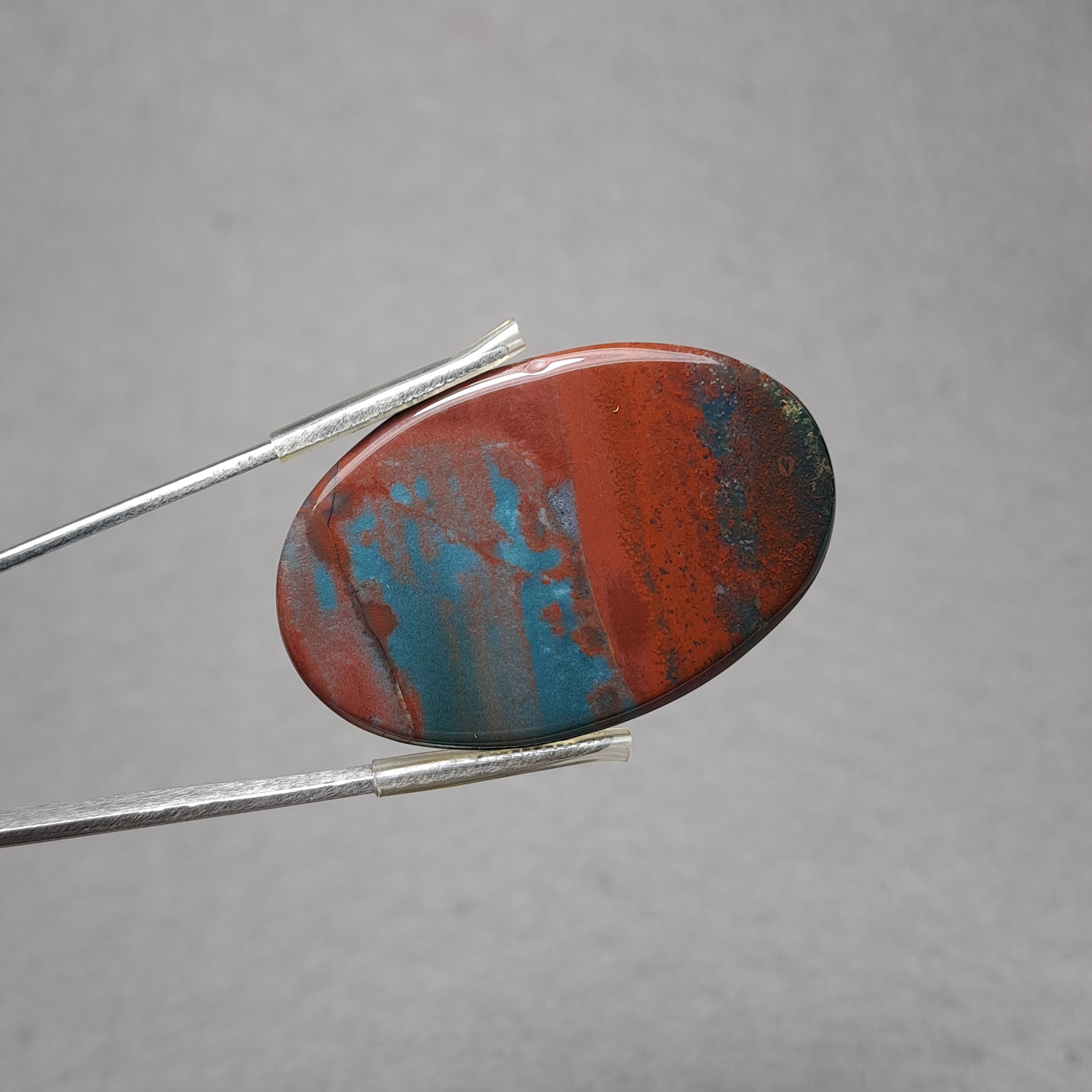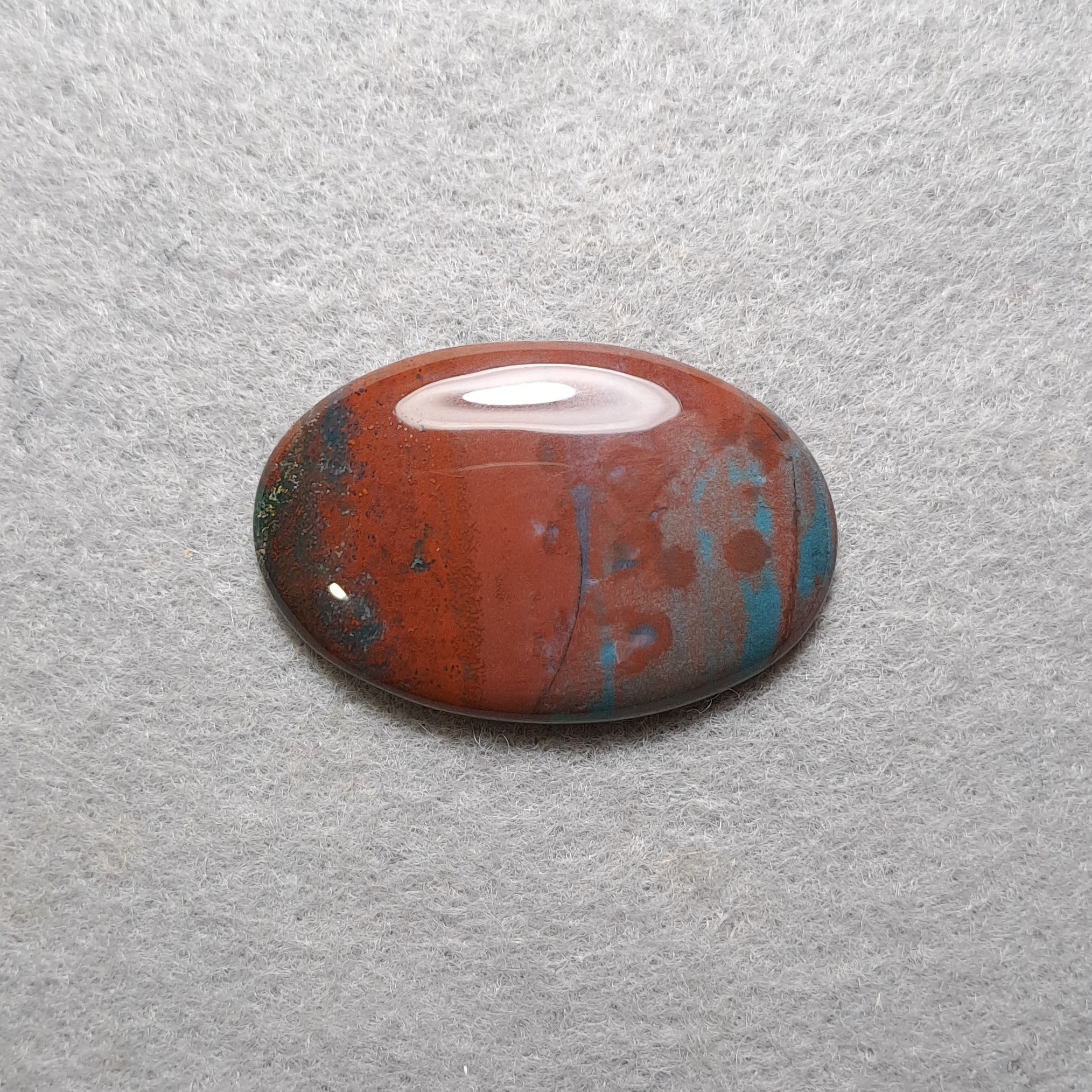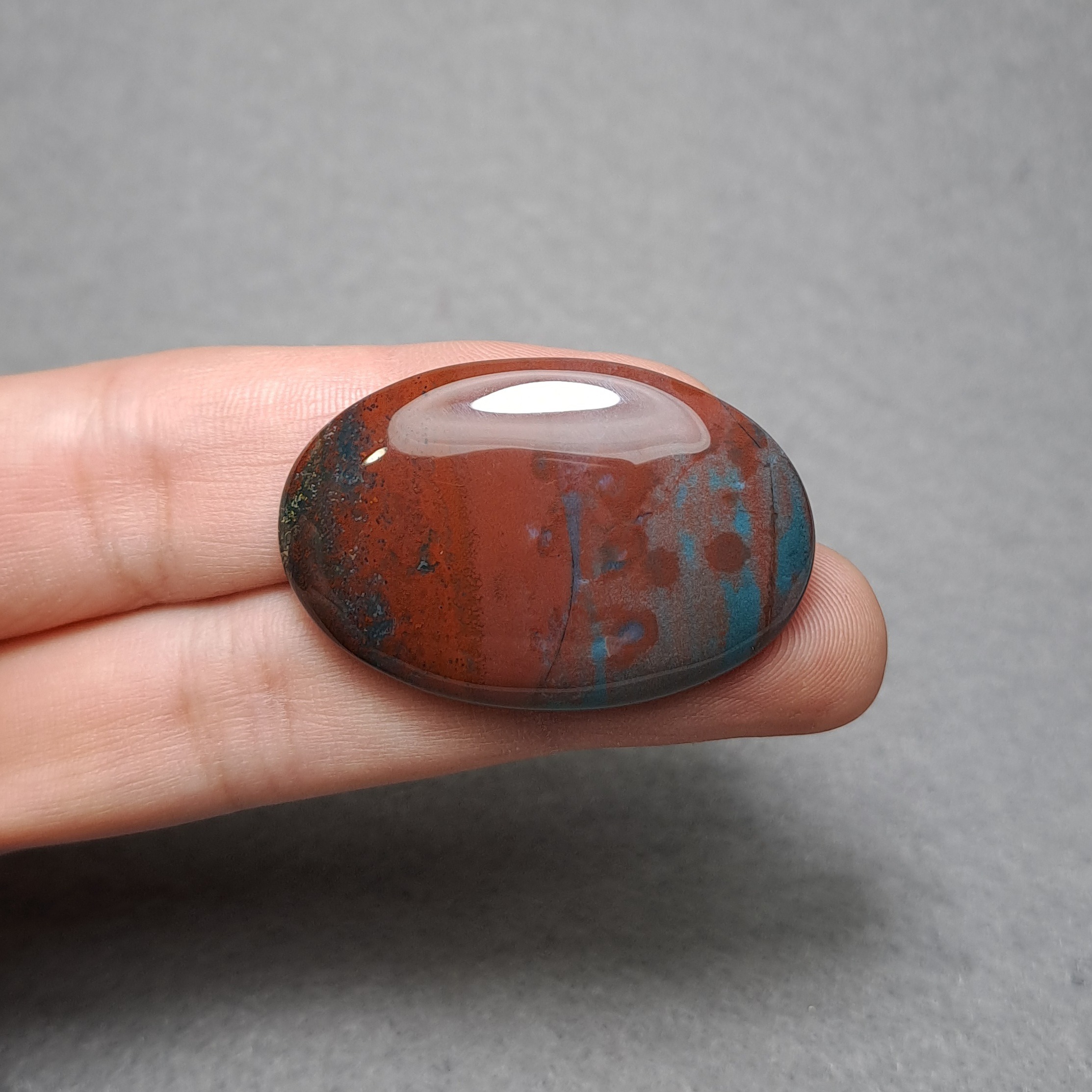 هلیوتروپ بسیار باکیفیت "پلاسما" از نوع بسیار مرغوب هندی، با زمینه سبز یشمی، سبزوآبی خوش رنگ و کمیاب و لکه های رنگی متنوع و لکه های قرمز "یشم قرمز" بسیار زیبا و هارمونیک. درشت و خوش سایز، کیفیت عالی. مناسب آویز گردنی و مناسب برای ساخت هرگونه زیورالات