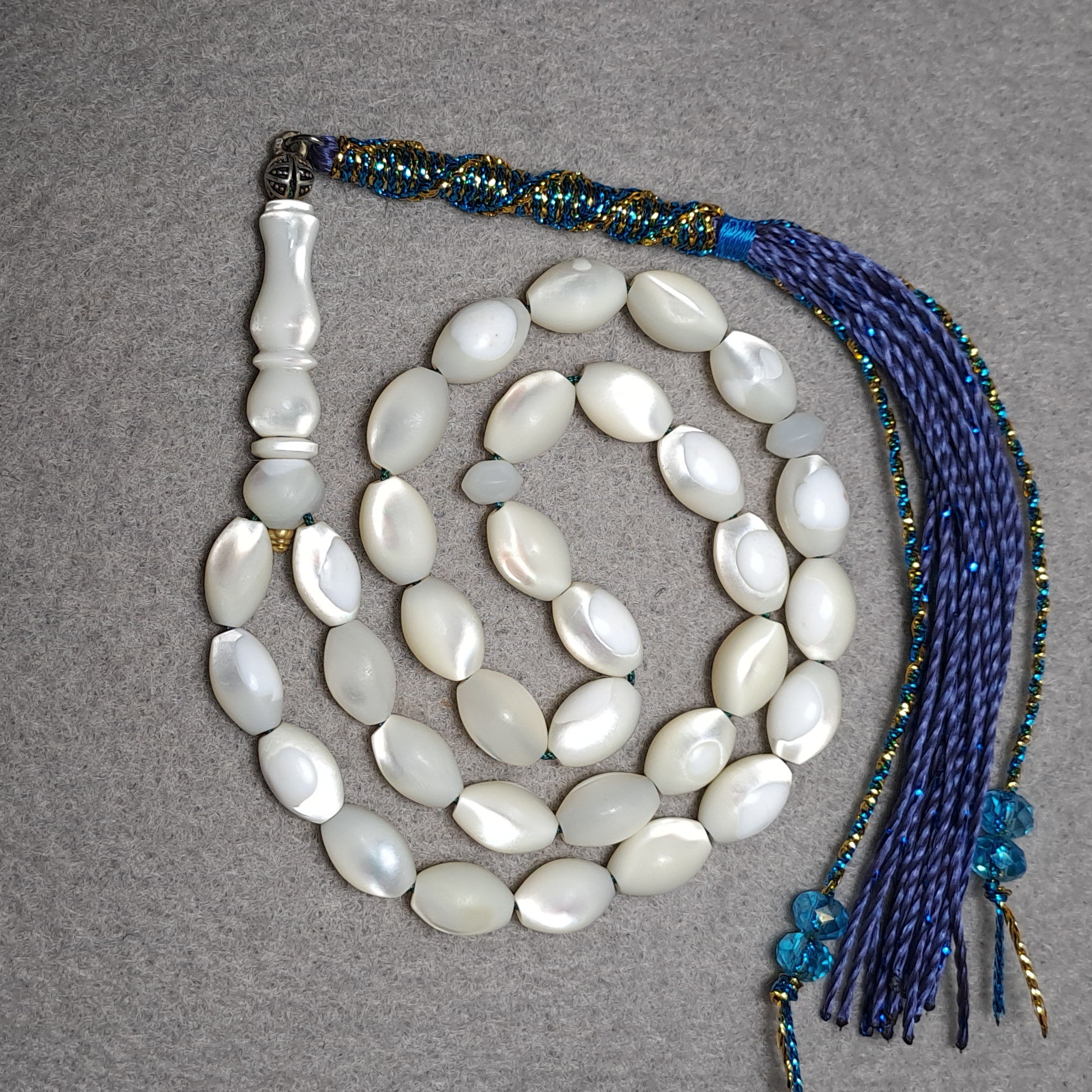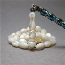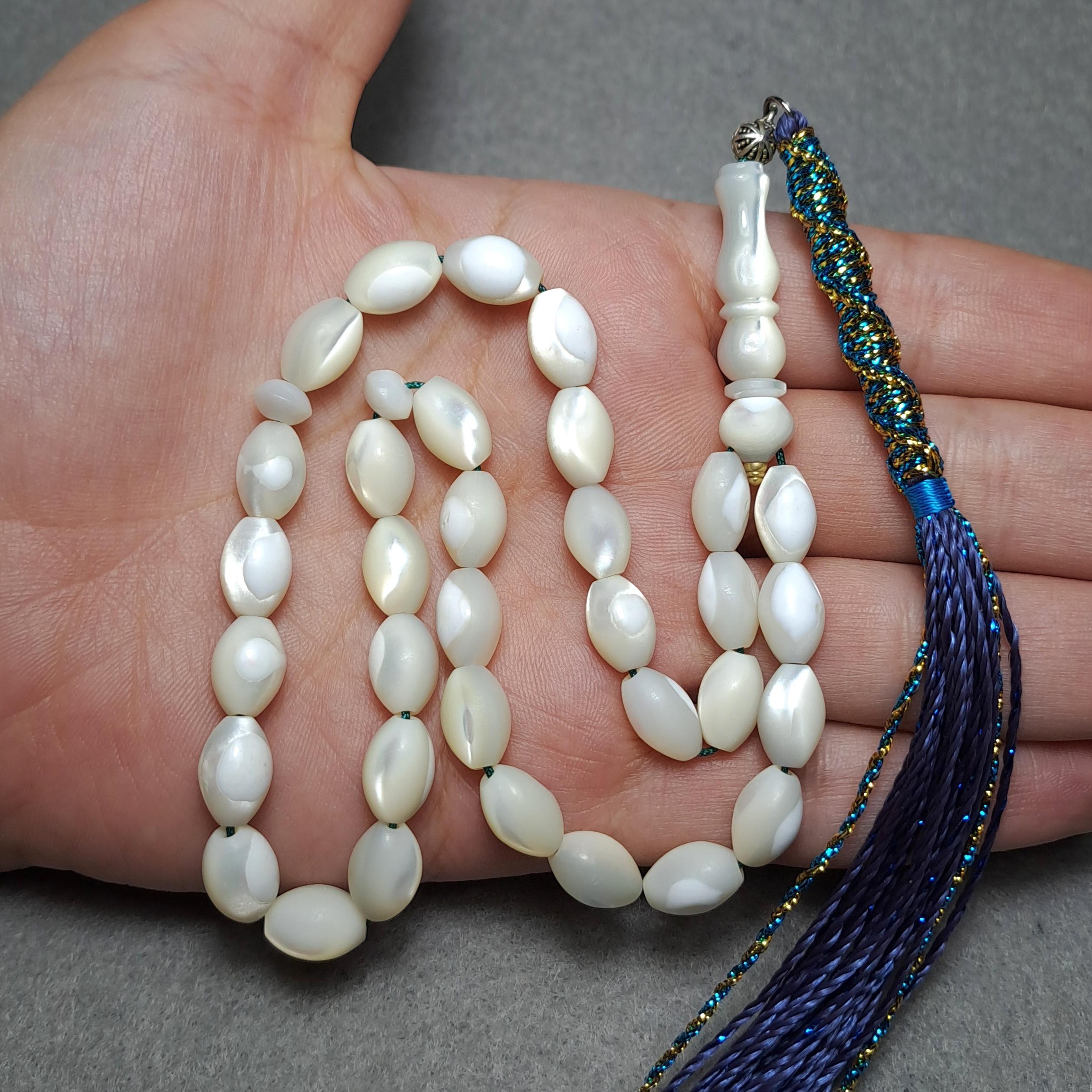 تسبیح صدف 33 دانه طبیعی دست تراش فاخر و باکیفیت. تراش زیبای گندمی، رفلکس نوری عالی با عدسیهای خوشتراش زیبا. شیخک دو سوراخ و سه تکه کار شده تراش دست و یراق برنجی تراشکاری شده، نفیس و خوش دست. سایز کارمندی خوش قواره، تراش از ریز تا درشت، میانگین سایز دانه ها: 8×11 میل، سرتسبیح بافت تلفیقی مکرومه و زربافت با بهترین کیفیت ممکن. اثری خاص و بدون مشابه کلکسیونی.