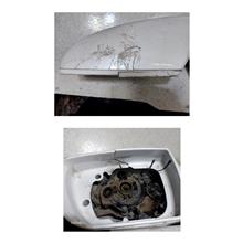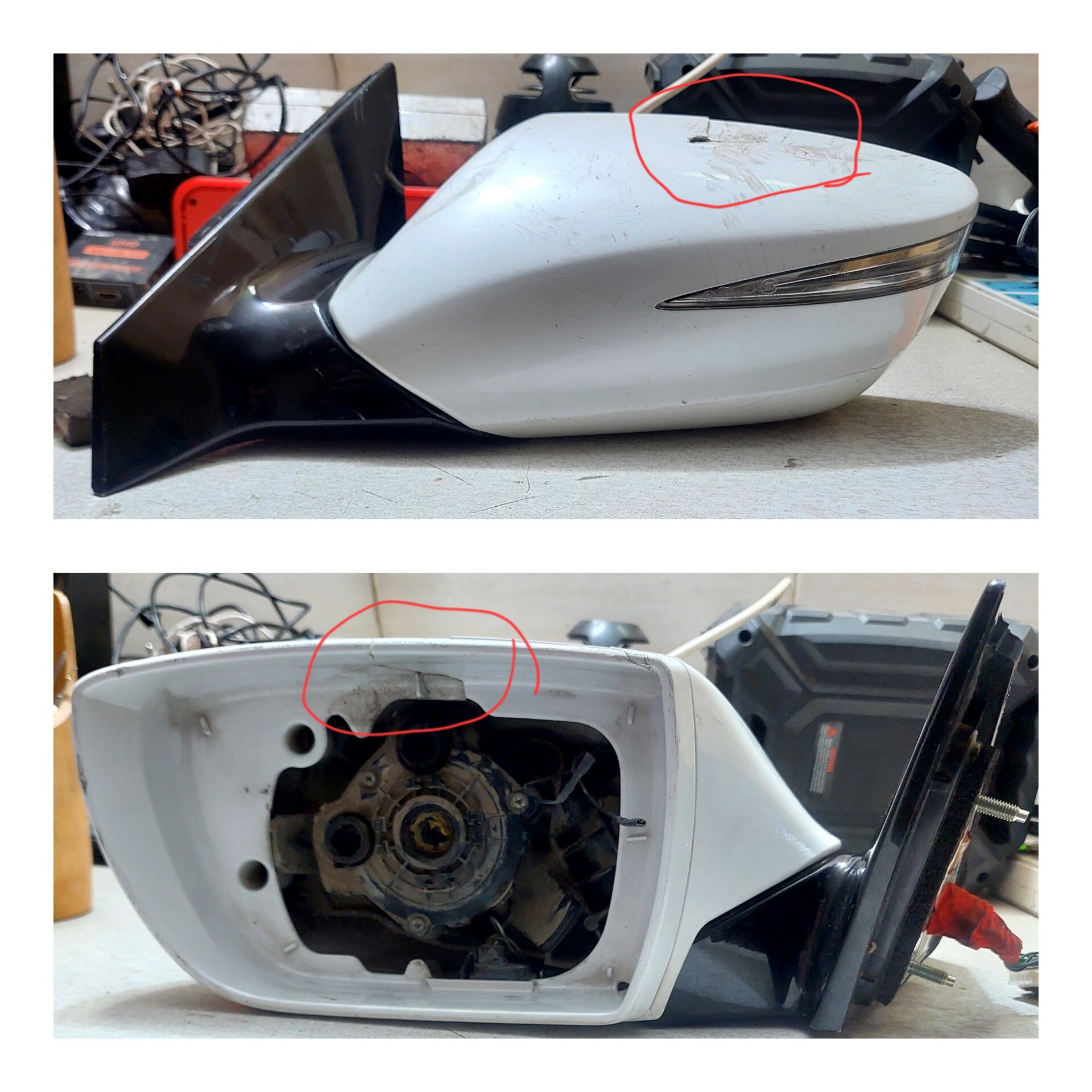 شکستگی دارد که داخل عکس با خط قرمز دور آن خط کشیده و مشخص شده است  و شیشه آینه هم نداره که مشخصه