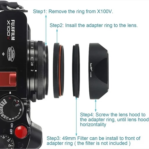هود لنز فلزی مستطیلی Haoge LH-X54B به همراه حلقه تبدیل 49 میلیمتری برای لنز دوربین Fujifilm X100VI Fuji FinePix X100V ساخته شده از الیاژ باکیفیت و ضد خش