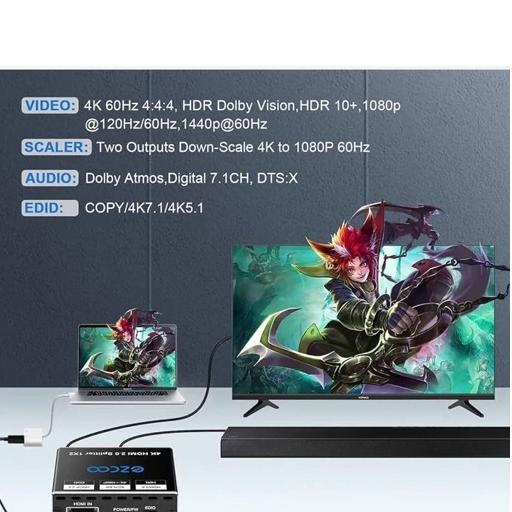 به روز رسانی سیستم عامل : تنظیم HDCP از طریق پورت micro USB. پشتیبانی از VRR پس از بهروزرسانی میانافزار (نزدیک درگاه HDMI IN) پشتیبانی از Windows، iOS کابل استاندارد HDMI 2.0 AWG26 توصیه شده کمتر از 3 متر لطفاً توجه داشته باشید: اسپلیتر ezcoo SP12H2 4K HDMI Splitter 1x2 HDR, Dolby Vision Atmos, Down Scaler, 4K 1080P Sync, 4:4:4, HDCP2.2, EDID 4K5.1/4K7.1/Copy,