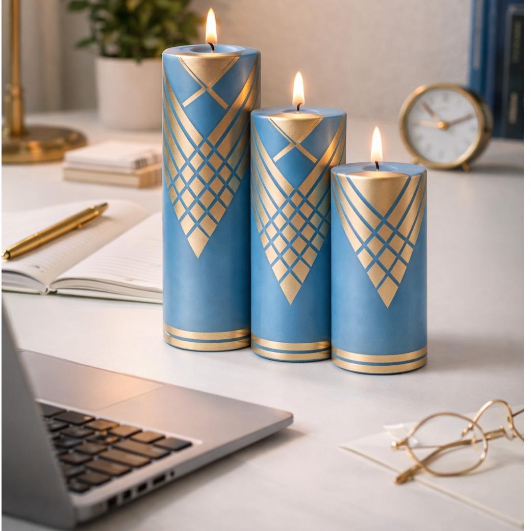 ست شمع دکوری شیک و خاص، مناسب دکوراسیونهای مدرن و لوکس. ترکیب رنگ آبی مات با خطوط هندسی طلایی جلوهای بسیار چشمنواز ایجاد کرده و انتخابی عالی برای میز، اتاق نشیمن، اتاق خواب، محل کار و دکورهای خاص است.