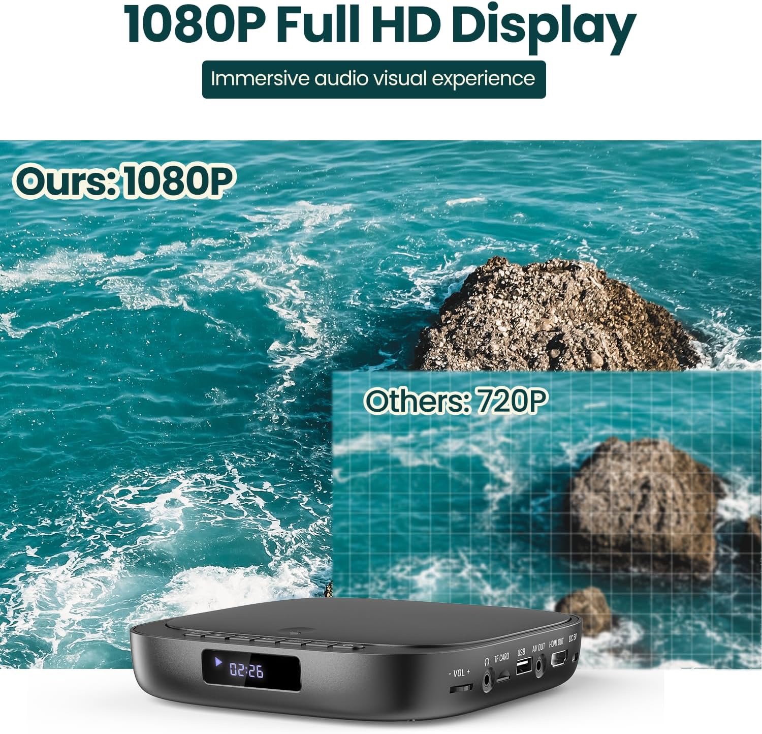 HDMI 1080P و قابل حمل: پخشکننده DVD HDMI کیفیت HDMI 1080P را ارائه میدهد و یک تجربه صوتی و تصویری فراگیر را برای شما به ارمغان میآورد. میتوانید این پخشکننده DVD کوچک را که تنها 15 سانتیمتر * 16 سانتیمتر * 3 سانتیمتر است، حمل کنید و سفر را پر از لذت کنید.