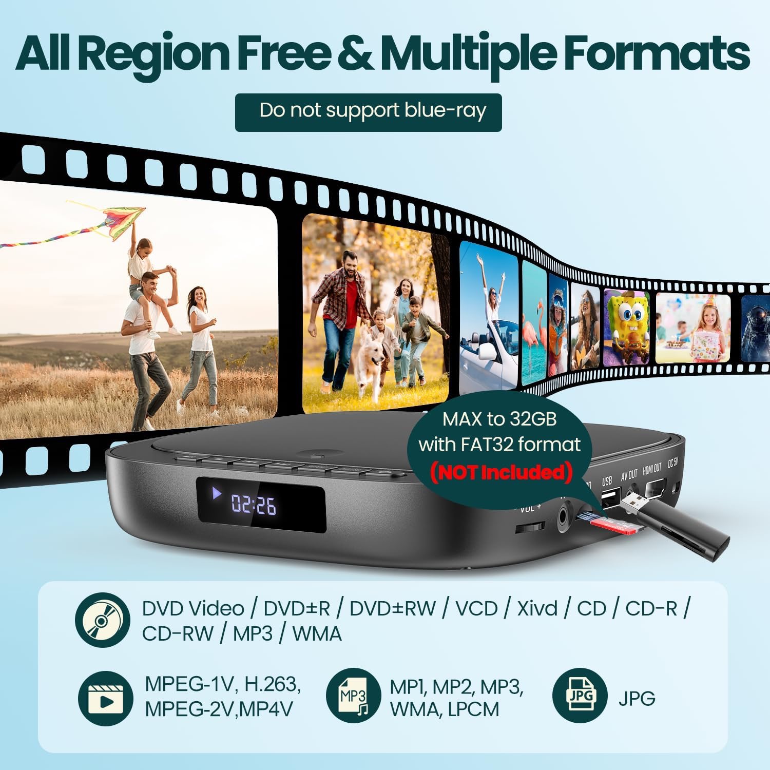 پخش کننده DVD مینی Desobry برای تلویزیون هوشمند، چند منطقه ای، پشتیبانی از ورودی کارت USB/TF، کابل HDMI/RCA