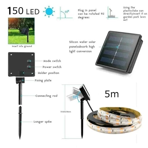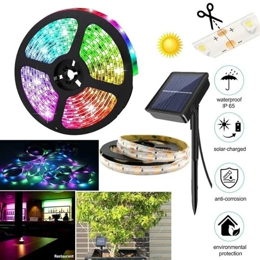نوار چراغ LE ضد آب، IP65، چراغهای رشتهای قابل تنظیم انعطافپذیر ،، نورپردازی فضای باز و فضای داخلی نوار LED خورشیدی: باتری قابل شارژ داخلی. با شارژ 6 تا 8 ساعت در روز، 8 تا 12 ساعت در شب کار میکند و به طور خودکار هنگام غروب روشن میشود. ساعات کار با توجه به میزان شارژ باتری در روز (آفتابی، ابری) تعیین میشود.