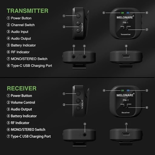 لوازم جانبی کامل: این مجموعه شامل یک فرستنده و گیرنده بیسیم، یک کابل دوگانه USB Type-C برای شارژ همزمان و یک کابل صوتی 3.5 میلیمتری برای اتصال به میکسرها، کارتهای صدا، بلندگوها و آمپلیفایرهای گیتار است