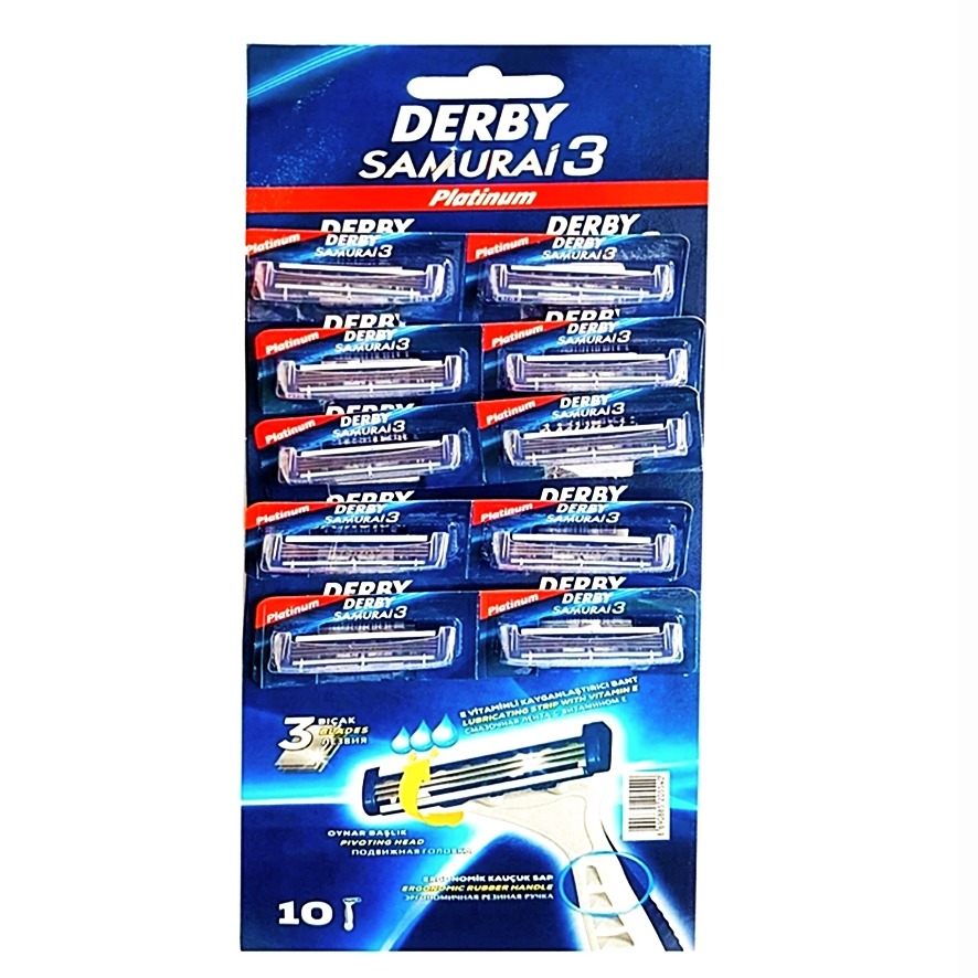 خودتراش دربی مدل سامورایی 3 دارای سه تیغه از جنس پلاتینیوم است که ضدآب و ضداکسید شدن است.
