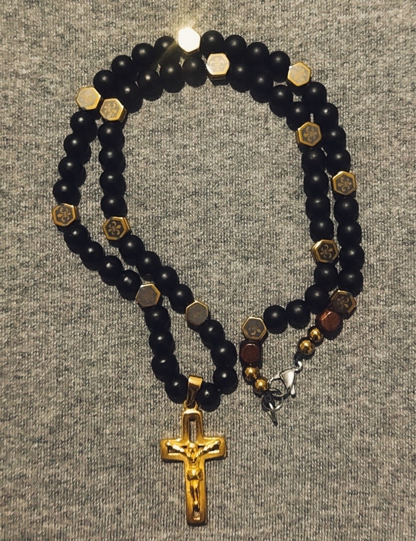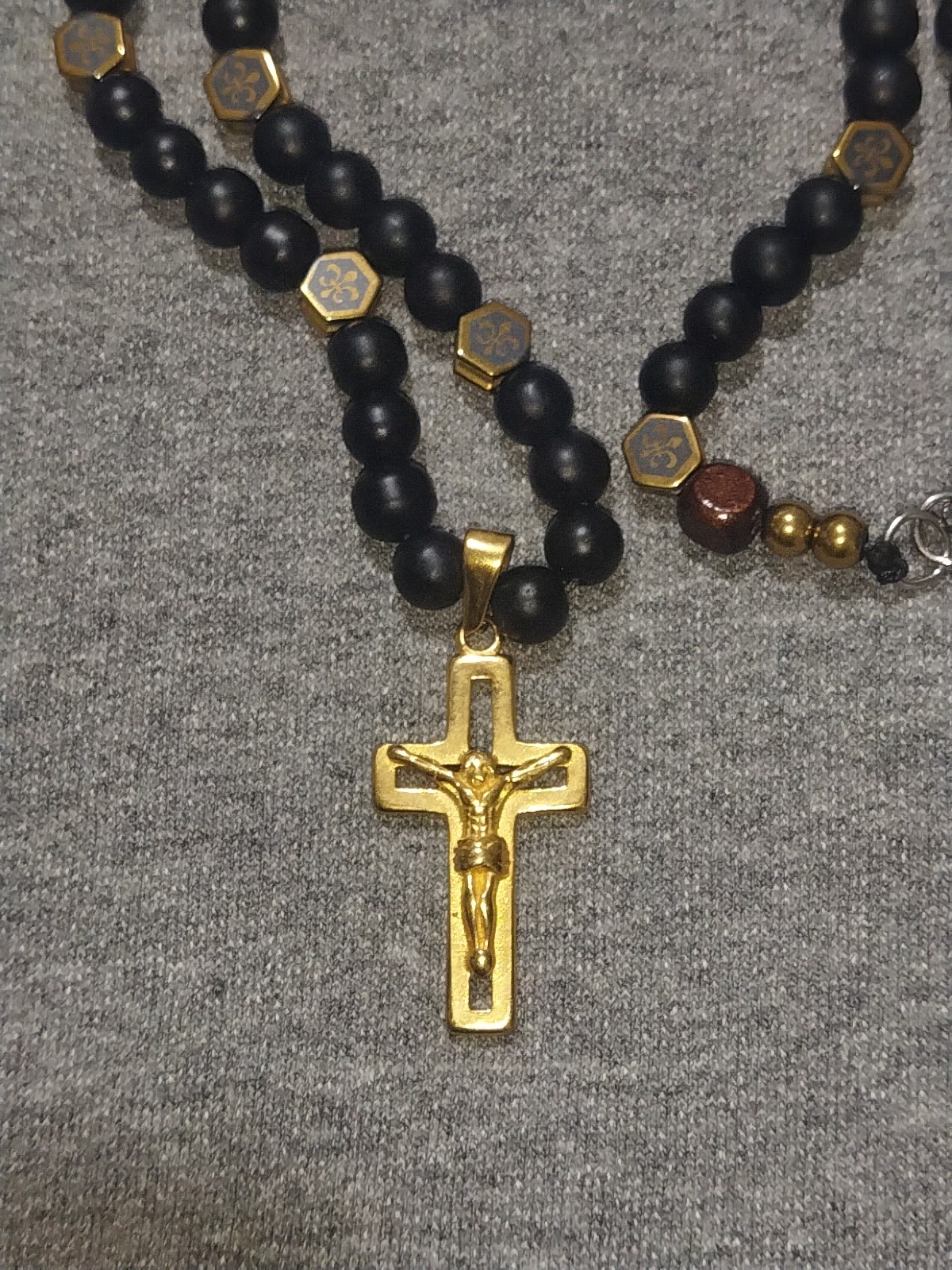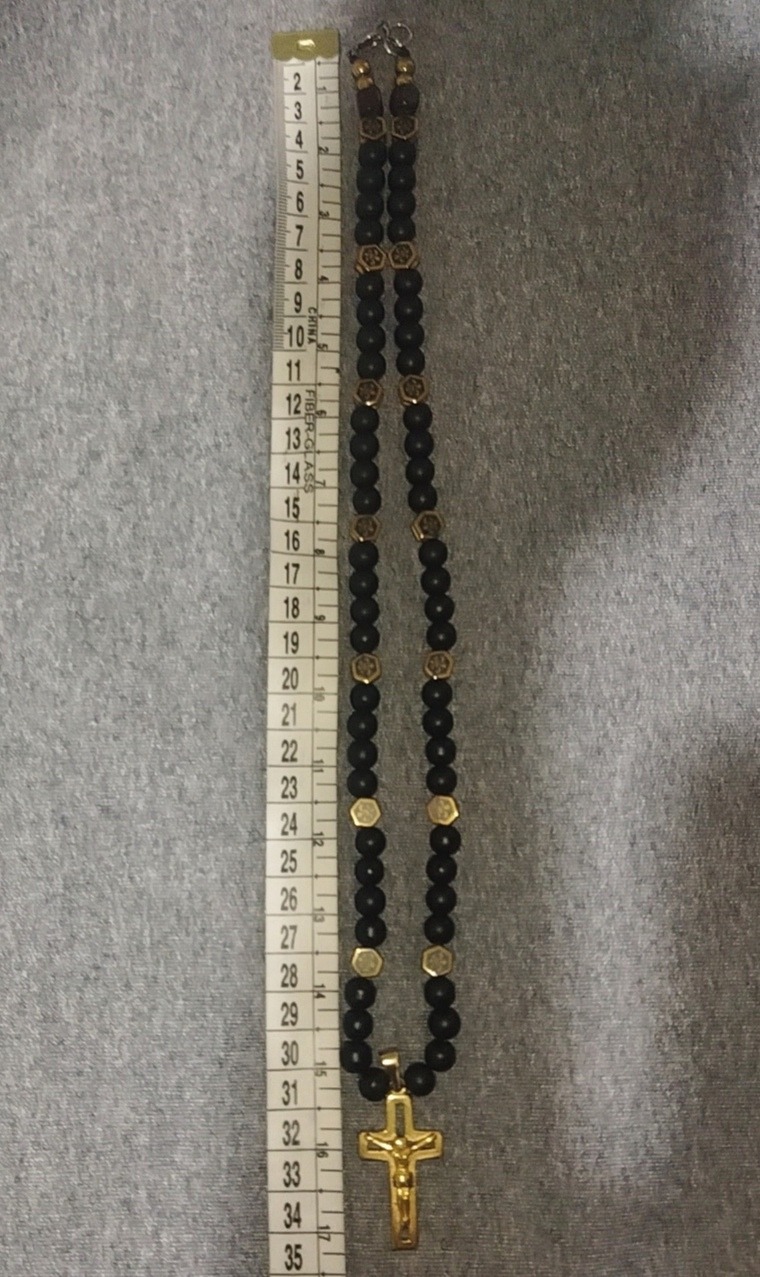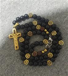 گردنبند با سنگ های اونیکس و حدید طلایی ها و چاپ لیزری داره که به هیچ عنوان پاک نمیشه با قفل استیل  که رنگش ثابت هستش گردنبد خاص مناسب هدیه کاری تک و دست ساز