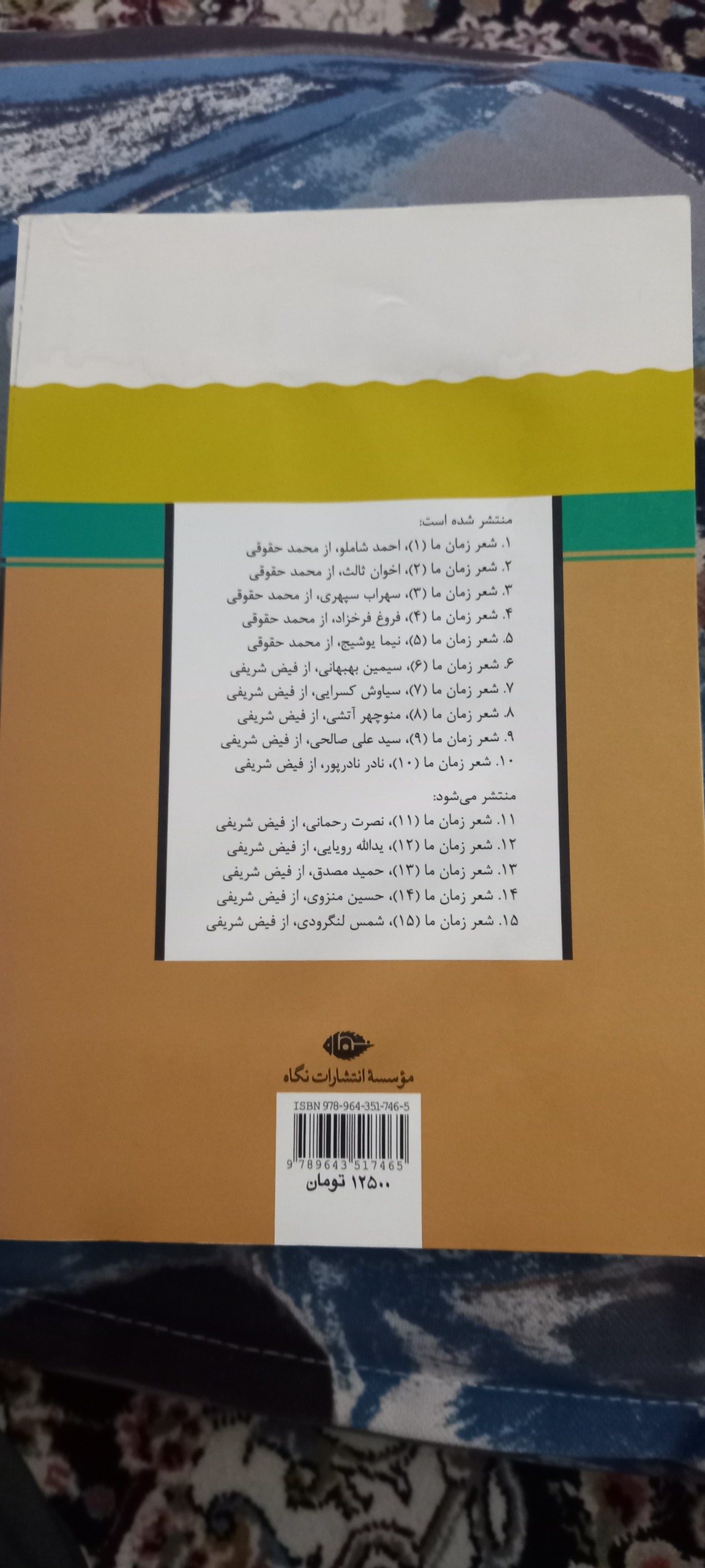 شعر زمان ما این کتاب ر یک مقدمه 64 صفحهای ابتدا زندگینامه یمین بهبهانی را بررسی میکند و پس از آن ویژگیهای هنری و ادبی شعری شعری او را ز جهات مختلف به تصویر میکشد این کتاب 343 صفحه دارد جلد شومیز و قطع رقعی لبههای برگه قسمت پشتی کتاب کمی آثار آب خوردگی دارد سعی کردم آن را در تصویر نشان بدهم برای همین هم قیمتشو پایینتر در نظر گرفتم