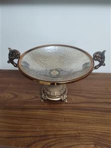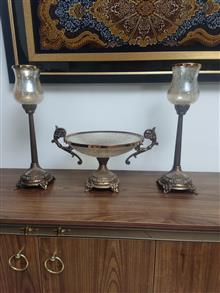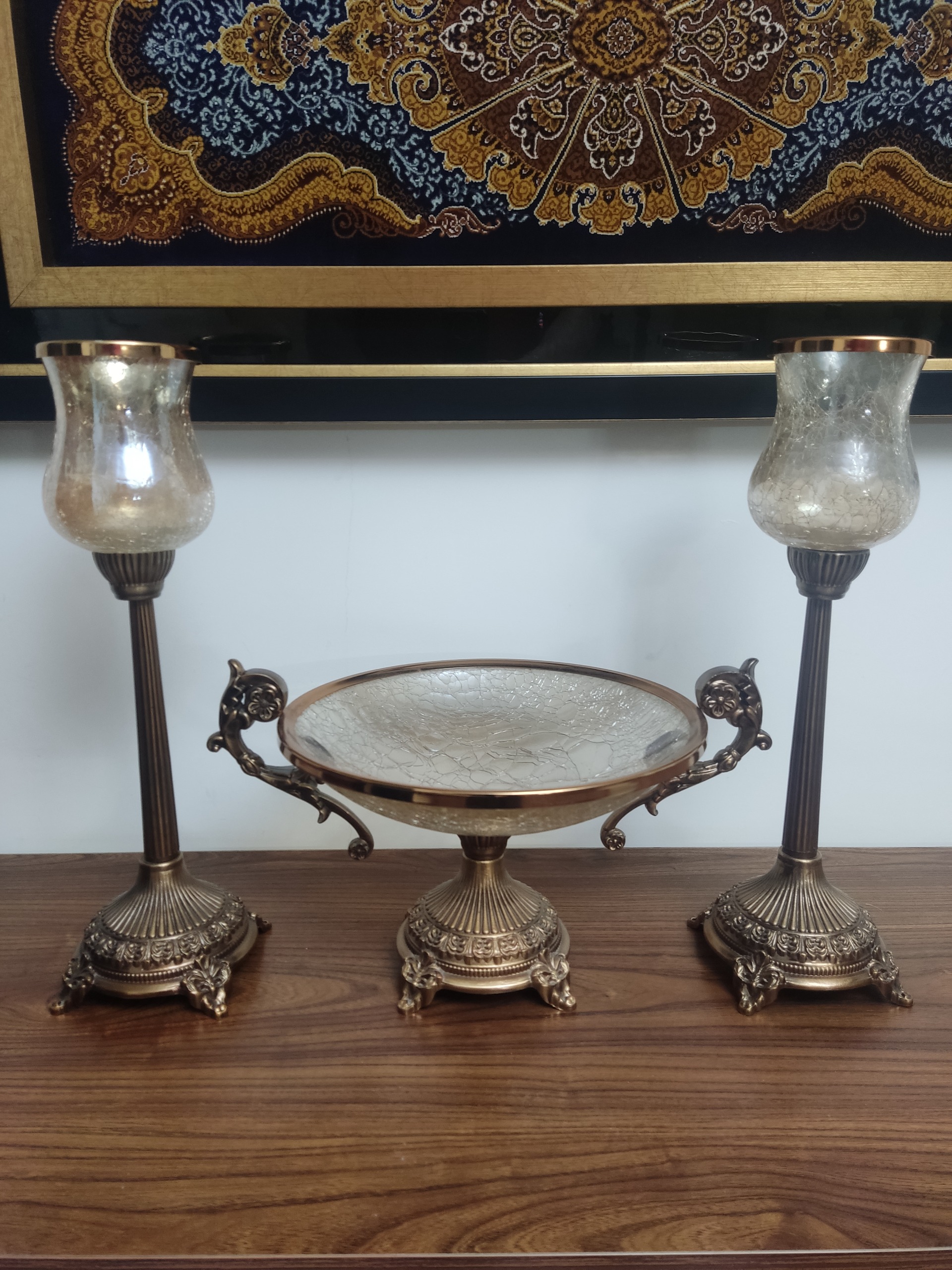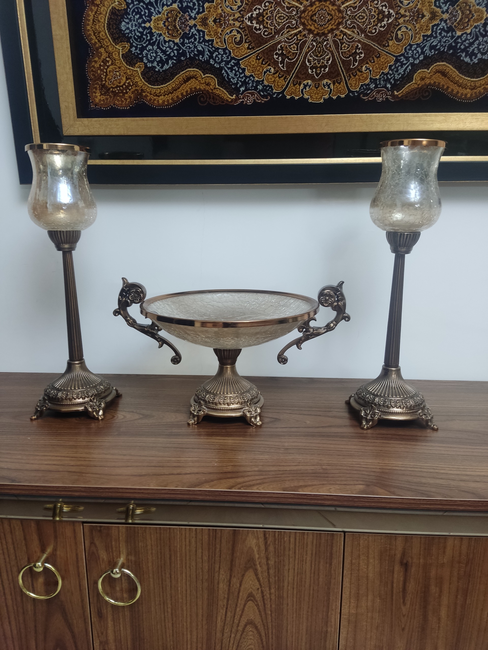 ست میوه خوری و یک جفت شعمدان با جنس آلومینیوم رنگ ثابت معروف به مدل شیشه آب گز ارتفاع شعمدان ها 45 سانتیمتر و قطر دهانه میوه خوری 30 سانتیمتر و ارتفاع میوه خوری 23 سانتیمتر مطابق تصویر که تا کنون استفاده نشده است . خواهشمندم از دیگر کالاهای اینجانب دیدن فرمایید.