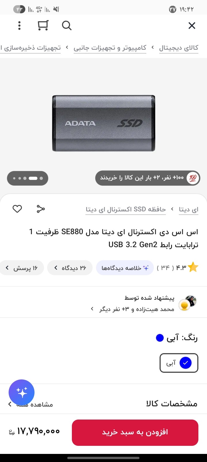 هارد ssd اکسترنال Adata 1t