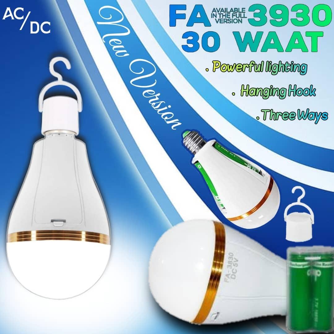 این لامپ اضطراری شارژی با توان 30 وات مدل FA-3930،با رنگ سفید و جنس نشکن عالی ساخته شده است که وسیله ای ضروری برای هر خانه ای می باشد و به سرپیچ معمولی خانگی با برق 220 ولت متصل می شود. ولتاژ این لامپ اضطراری ولتا و فرکانس آن 50 تا 60 هرتز م ی باشد. با