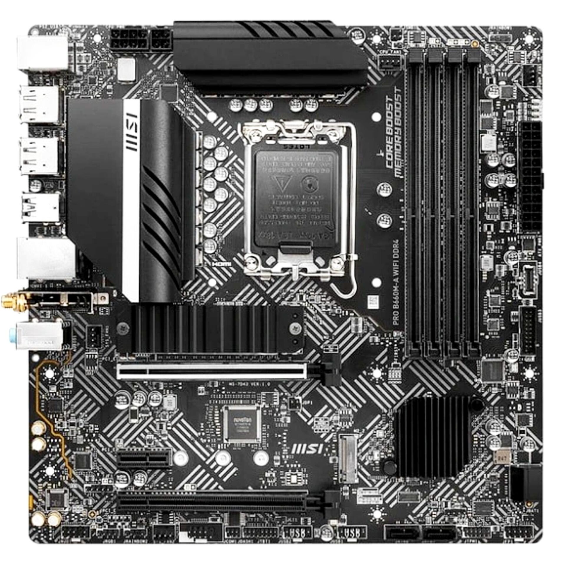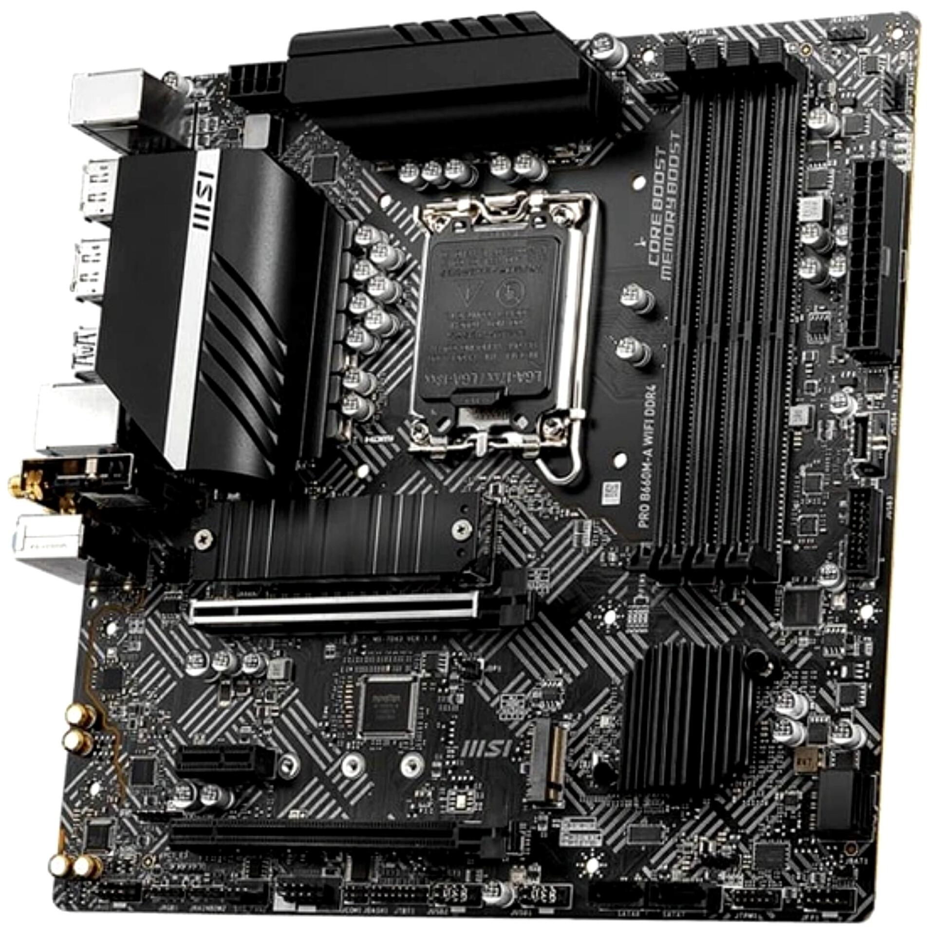 مادربرد MSI PRO B660M-A WIFI DDR4 از سوکت LGA 1700 بهره میبرد و از پردازندههای Intel Core نسل 12، 13 و 14، همچنین Intel Pentium Gold و Celeron پشتیبانی میکند. این مادربرد چهار اسلات DIMM برای حافظه DDR4 با فرکانس 4800+ مگاهرتز (OC) دارد و با پیکربندی دوکاناله، عملکرد سریع و پایداری را تضمین میکند.