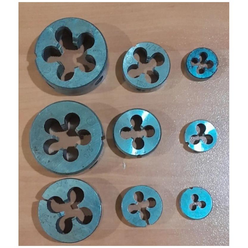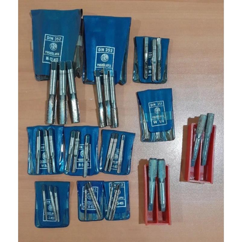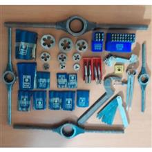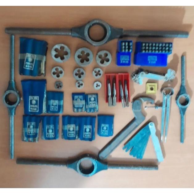 لوازم تراشکاری شامل تعدادی حدیده و قلاویز و دسته حدیده fra یوگسلاوی اصل ، گام سن رزوه Whitwort آلمان ، فیلر Elora آلمان ، پرگار صنعتی آلمان پانچ عدد و حروف لاتین MASU آلمان و آچار چاکنت william آمریکایی
