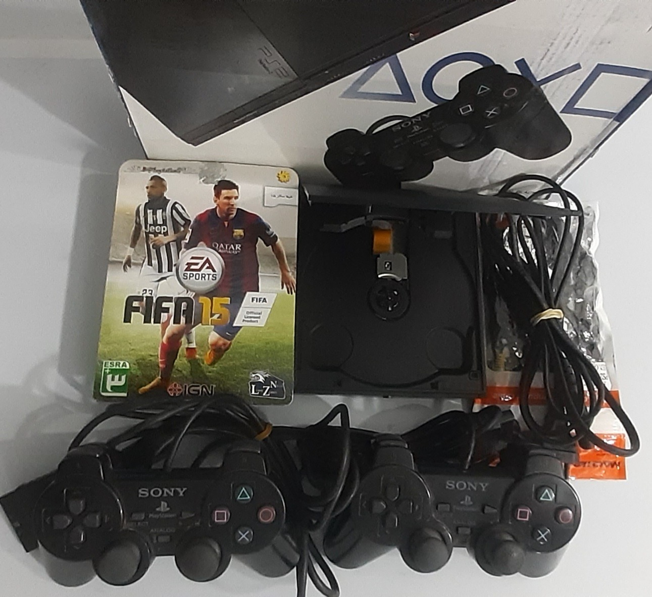 پلی 2  فلش خور ، لنز هم سالمه .هم با سی دی میشه بازی کرد هم فلشخور با ای سی ، بازی پلی 2،پلی 1 و سگا و میکرو  میشه رو فلش ریخت بازی کرد، 2 تا سی دی فیفا 15 و پی اس 20  همراهش ارسال میشه ، 3 فیش رنگی رنگ سفیدش روکشش پارشد چسب خورده مشکلی در کار کرد نداره .2 دسته اصلی باهاشه یکیش چراغ شک خرابه فقط و مشکلی نداره  در کار کرد شکها.   کنسول خط خش داره ولی تمیزه اقلام همراه، کارتون 2 دسته کابل برق و تصویر و 2 سی دی بازی